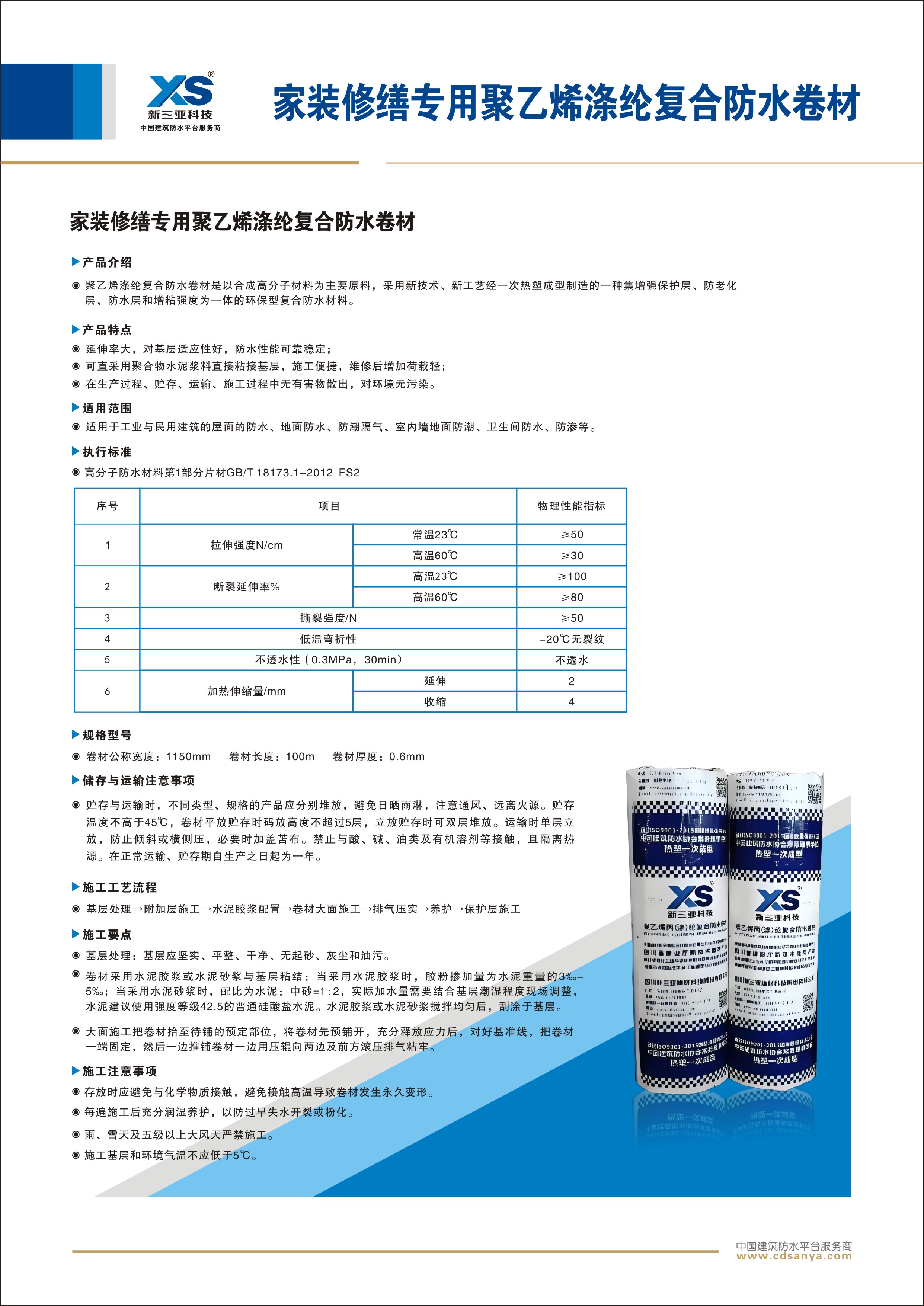 家裝修繕專用聚乙烯滌綸復合防水卷材是以合成高分子材料為主要原料,采用新技術、新工藝經一次熱塑成型制造的一種集增強保護層、防老化層、防水層和增粘強度為一體的環保型復合防水材料。