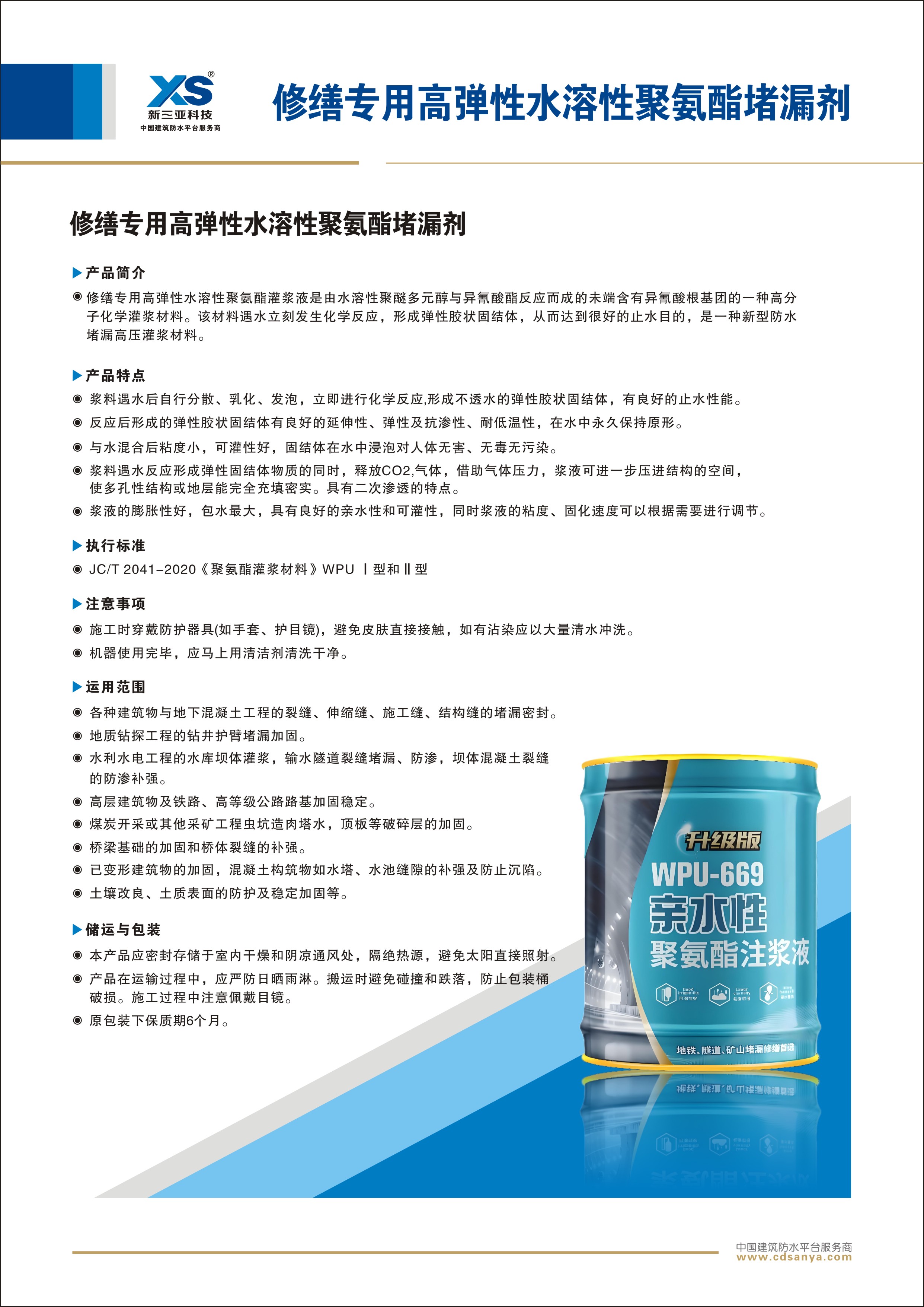 WPU-669水溶性聚氨酯灌漿液是由水溶性聚醚多元醇與異氰酸酯反應而成的未端含有異氰酸根基團的一種高分子化學灌漿材料。該材料遇水立刻發生化學反應,形成彈性膠狀固結體,從而達到很好的止水目的,是一種新型防水堵漏高壓灌漿材料。