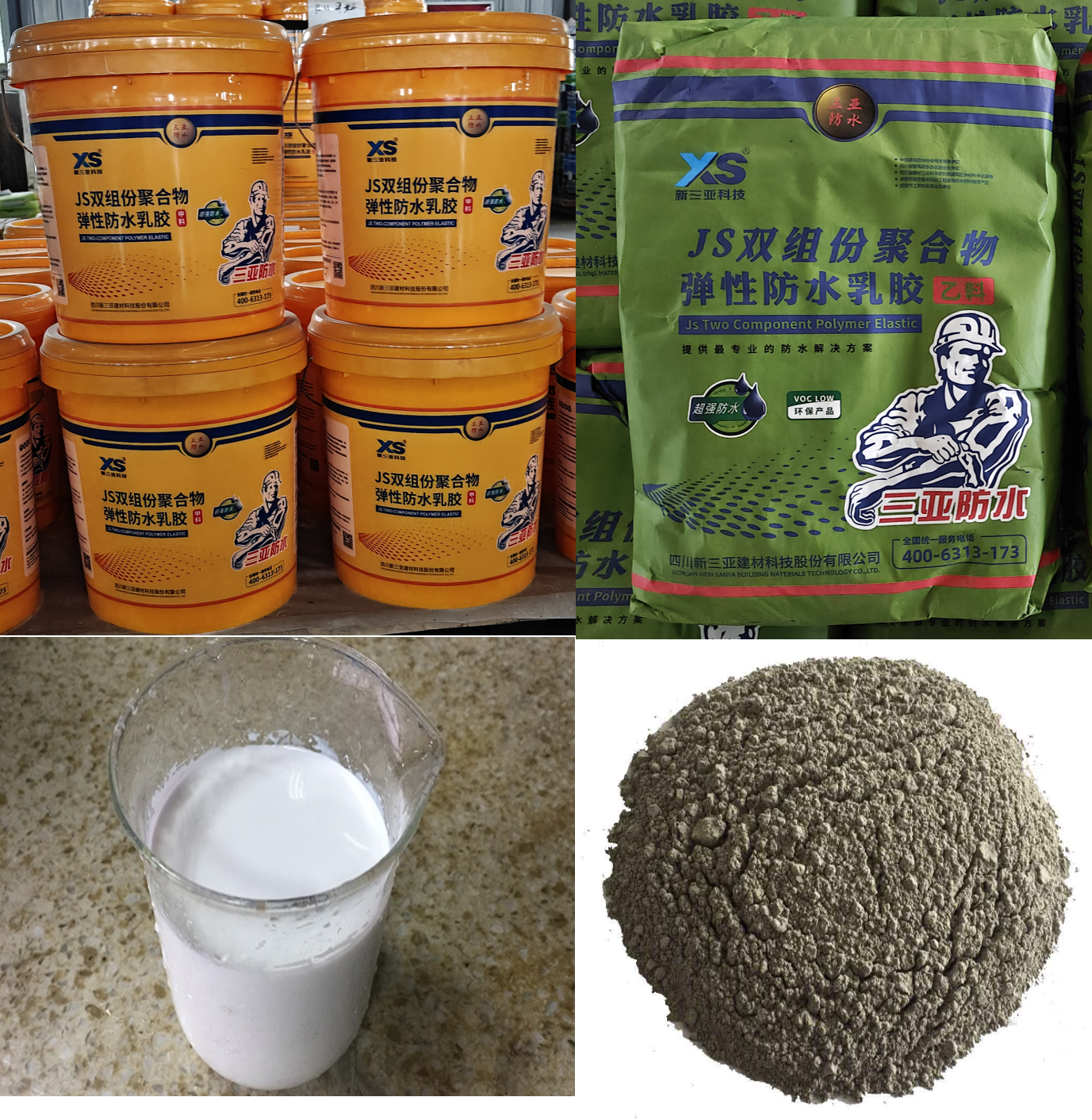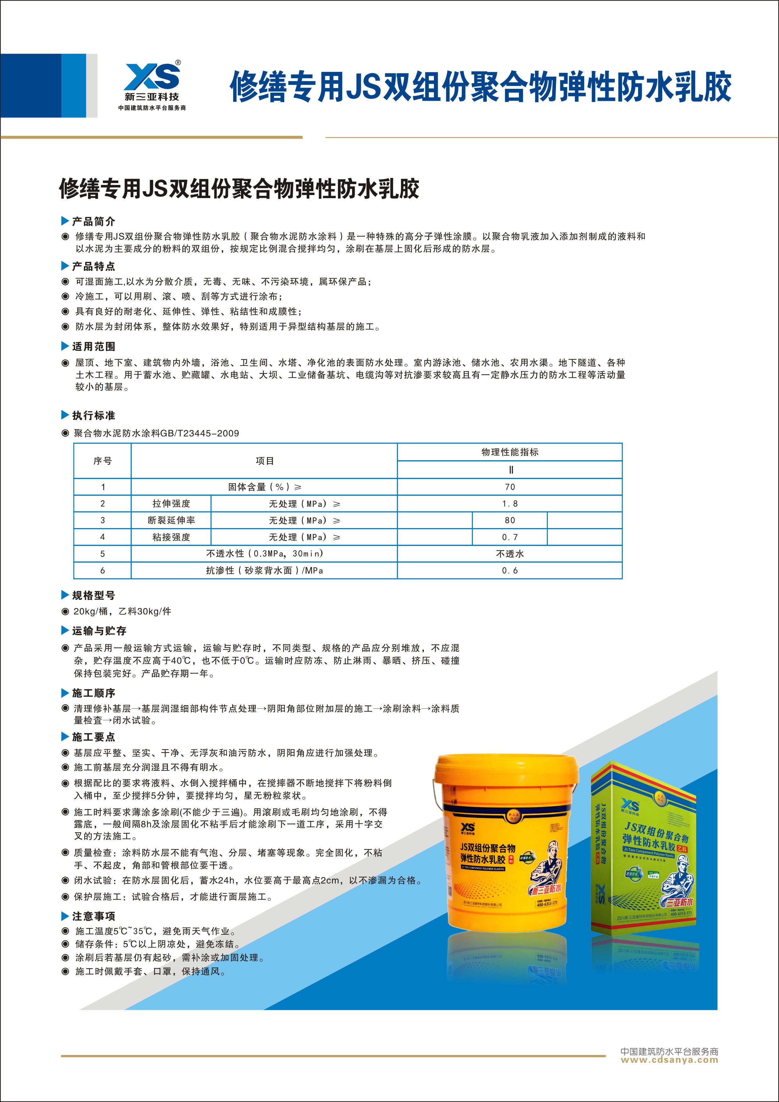 修繕專用JS雙組份聚合物彈性防水乳膠是一種特殊的高分子彈性涂膜。以聚合物乳液加入添加劑制成的液料和以水泥為主要成分的粉料的雙組份,按規定比例混合攪拌均勻,涂刷在基層上固化后形成的防水層。該產品由甲、乙組份組成。